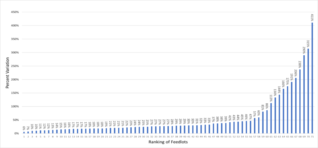 Through this action of sorting, the composition of the TMR changes as the total mixed ration is consumed. Specifically, small particles, such as micro-ingredients, fall out of the ration and are not mixed well due to their hydrophobic nature which makes them difficult to dissolve in a water slurry micro-ingredient applicator. These small particles, or fines, can be lost in the wind or are cleaned out of the bunk as fines and discarded. The financial costs of loss of fine particles in the ration are estimated to be from thousands to millions of dollars per year depending upon the size composition of the ration of the operation. The SarBatch TMRO has been demonstrated to reduce fines by, on average, 46.9% for more than 62 different rations and commercial feedyards as shown on Figure 2. Thus, the system reduces the loss and variation of both small feed particles and micro ingredients.